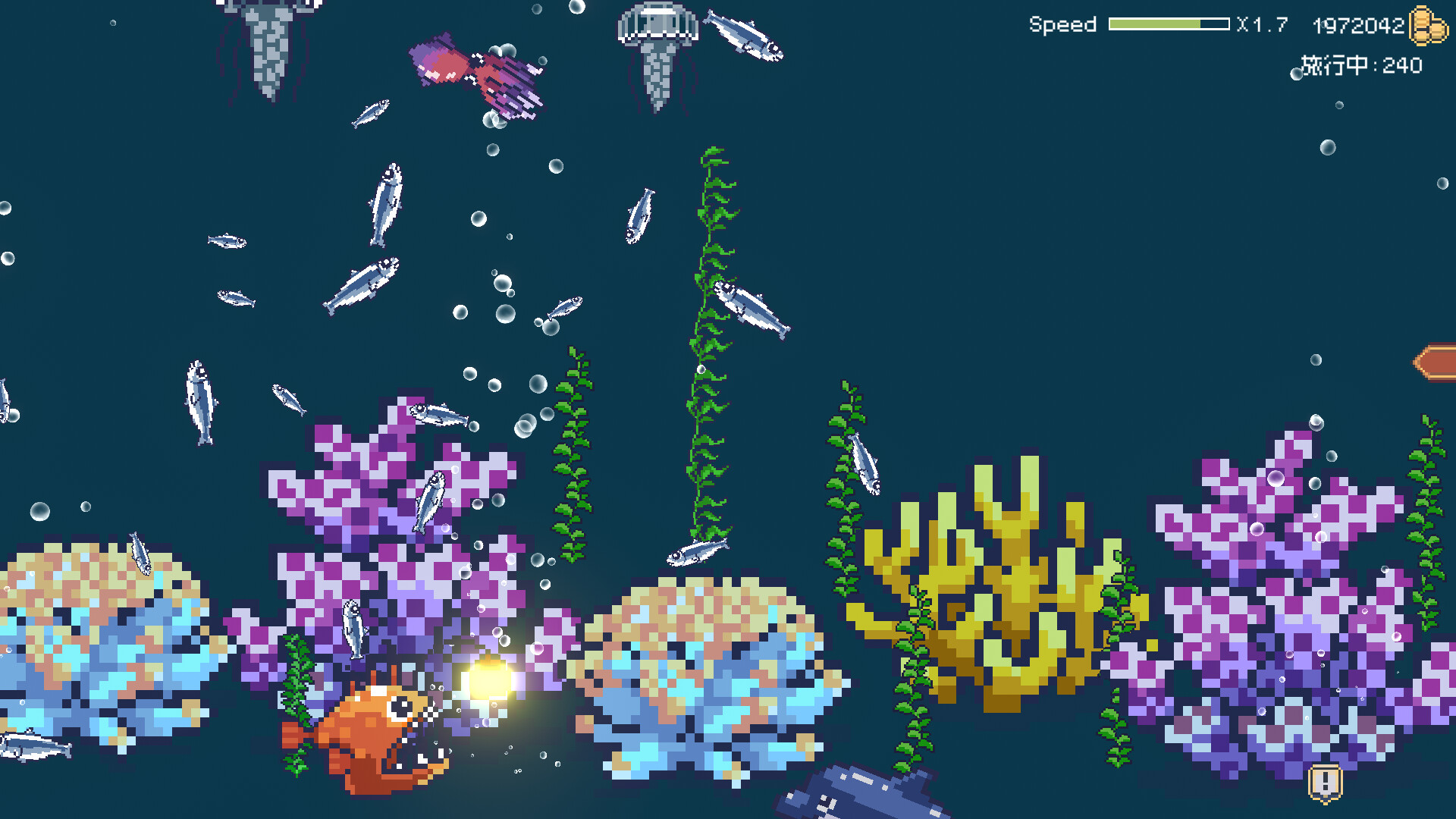 作为一个钓鱼佬,难道你不想看看给你的伙伴们展示一下你吊起的巨物?我们准备了一个水族箱,你可以把你吊起的鱼放入其中!并且每种鱼都有自己的特殊行为哦!我们这里展示其中一个:沙丁鱼。他们是群居生物,会尝试着抱成团!