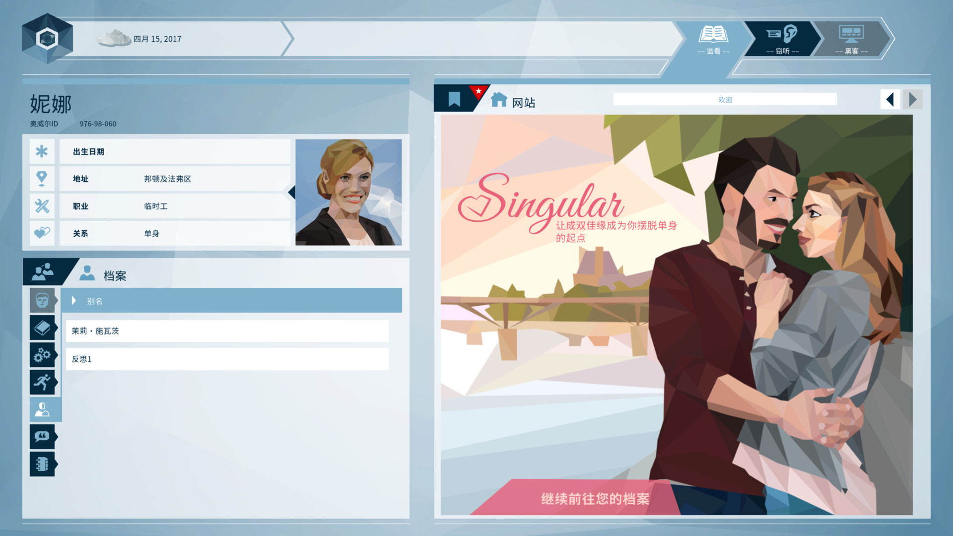 入侵嫌疑人的私人生活。监听聊天通讯、阅读私人邮件、入侵电脑、调阅医疗档案、建立信息之间的联系。找出一切你需要了解的信息。
